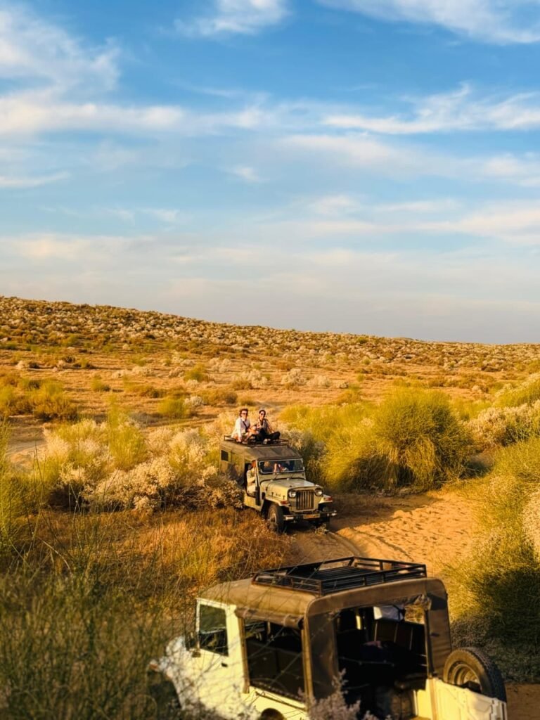 A magical Thar Desert safari in Thar Desert is an unforgettable journey into a golden world of endless sand dunes and timeless beauty. As the sun begins to set, the desert transforms into a canvas of glowing orange and soft amber hues, creating a truly mesmerizing atmosphere.