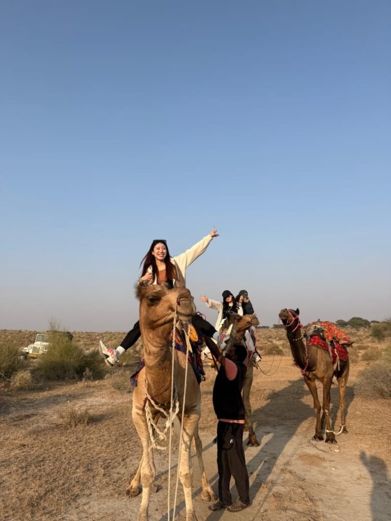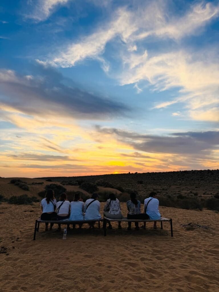 Riding on a camel across the dunes, you experience the quiet rhythm of the desert, far away from the noise of city life. The gentle breeze, the shifting sands, and the vast open sky give a sense of peace and wonder. As night falls, the desert comes alive with traditional Rajasthani music, folk dances, and the warmth of a campfire under a sky full of stars.
